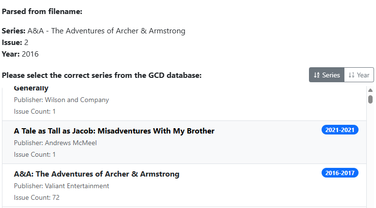 - Series Name Year - If no exact match, we search for Series Name and year and llok for the issue