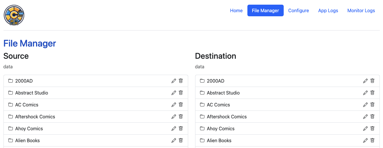 When the File Manager is loaded, it will display all files in your /data directory in both the Source and Destination locations.