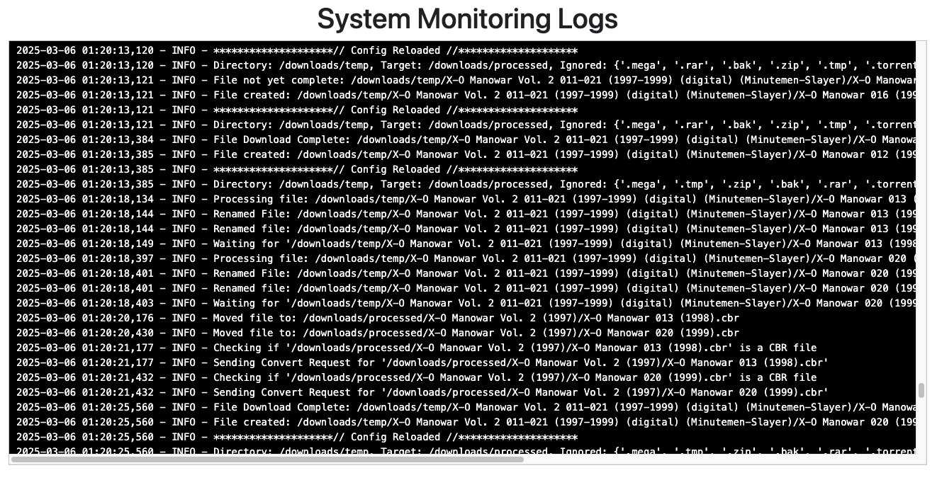 Folder Monitoring uses some of the base functions of the app to perform actions. Logs related to these actions (renaming, conversion, etc) are visible on the App Logs page.